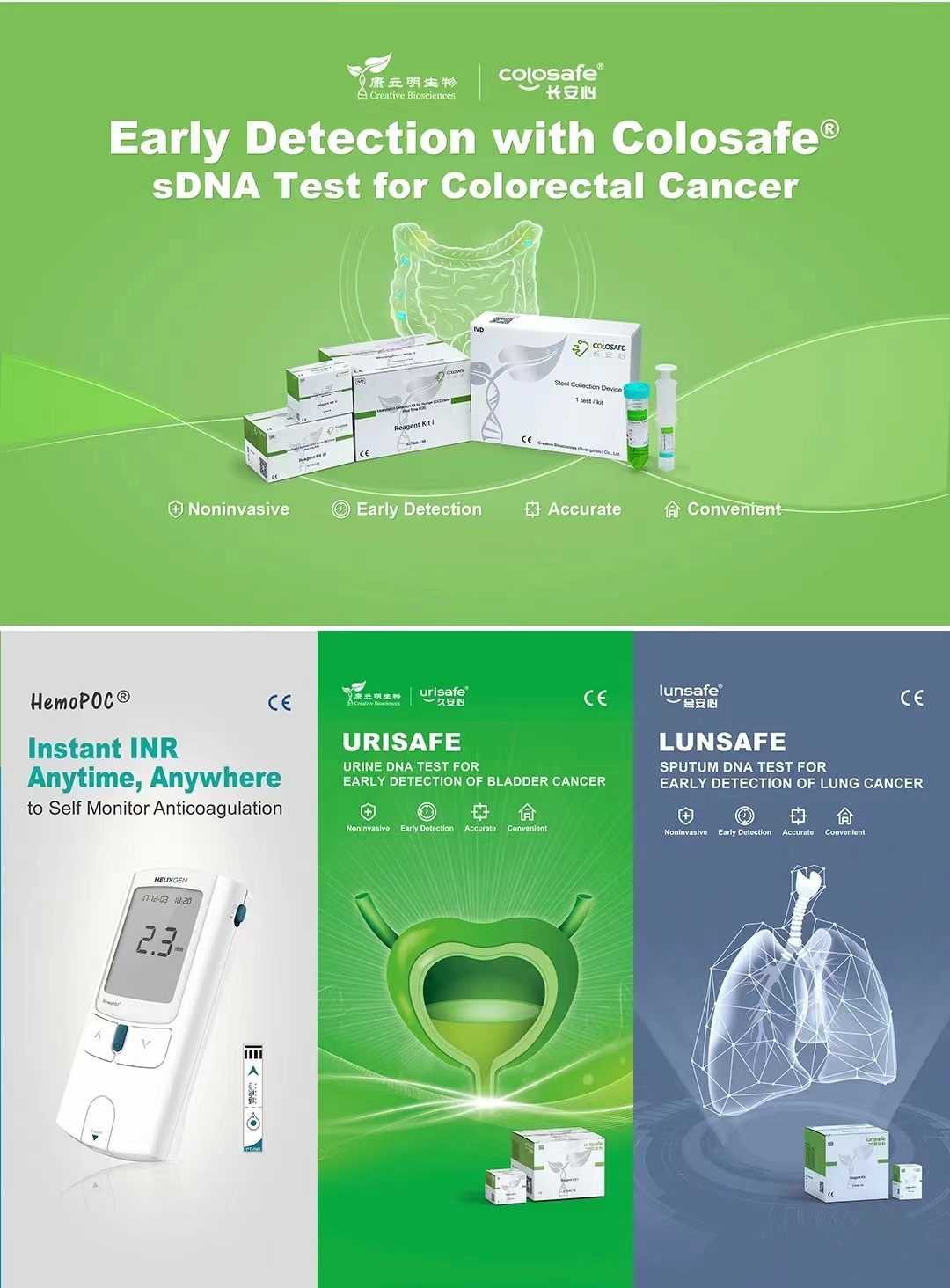 本次盛會,康立明生物攜長安心®糞便DNA腸癌檢測、久安心®膀胱癌基因檢測、會安心®肺癌基因檢測、全自動樣本預處理儀以及康立明全資子公司好芝生物產(chǎn)品HelixPOC®全自動微流控熒光PCR一體機、HemoPOC®凝血檢測系統(tǒng)赴展。