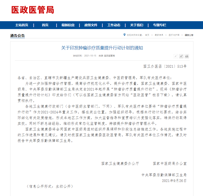 10月15日,國(guó)家衛(wèi)健委發(fā)布《關(guān)于印發(fā)腫瘤診療質(zhì)量提升行動(dòng)計(jì)劃的通知》,進(jìn)一步提升腫瘤診療質(zhì)量水平,規(guī)范診療行為,保障醫(yī)療質(zhì)量安全。